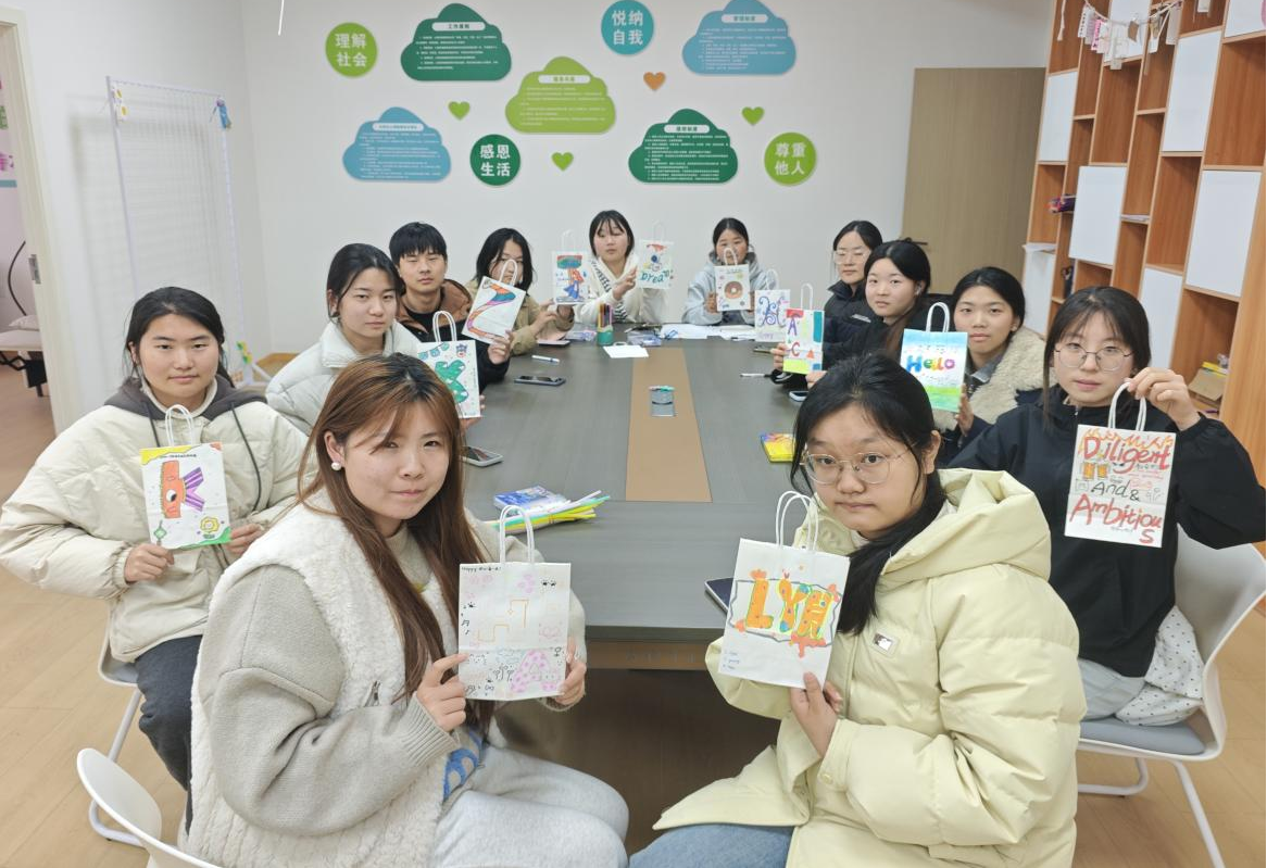 3月18日,学院举办了“字母创意涂鸦展”活动,学生从积极正向的多语种词汇中选取核心字符,对其进行创意涂鸦设计,赋予字母与假名温暖的心理意象。R代表resilient,H代表happy,は代表はる——色彩与意义交织,抽象的情绪在画纸上获得具象表达。创作结束后,所有涂鸦作品袋统一留存展示,并转化为后续活动的“树洞”装置,实现艺术创作与心理服务的有机衔接。