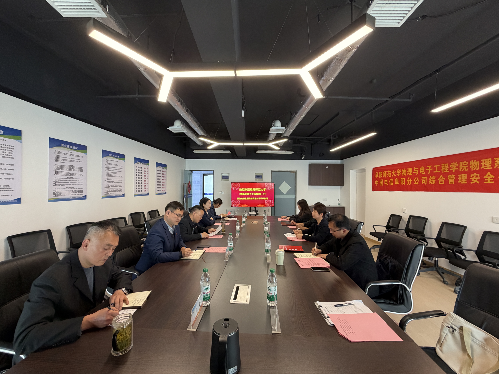 在中国电信阜阳分公司,郦丹芸和张朋一行与企业相关负责人进行座谈交流。郦丹芸围绕行业发展趋势、人才需求方向、岗位供给等与企业方深入沟通,详细了解企业运营现状、人才需求与长期发展规划。张朋向企业重点介绍了学院学科发展、人才培养、实践教学成果及毕业生就业优势,全面展示学院在电子信息及相关领域的育人实力。