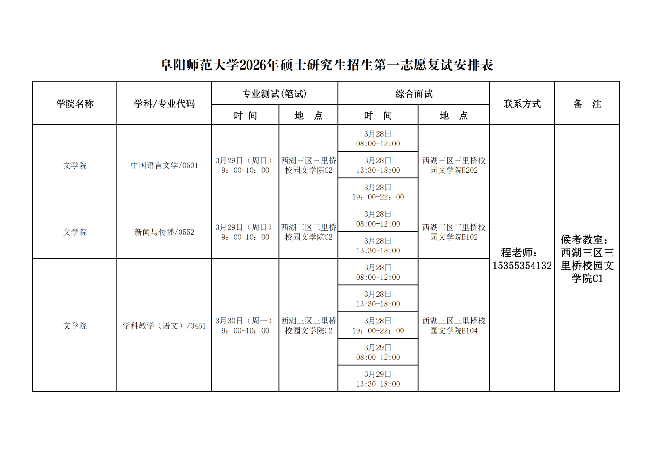 阜阳师范大学2026年硕士研究生招生第一志愿复试安排表