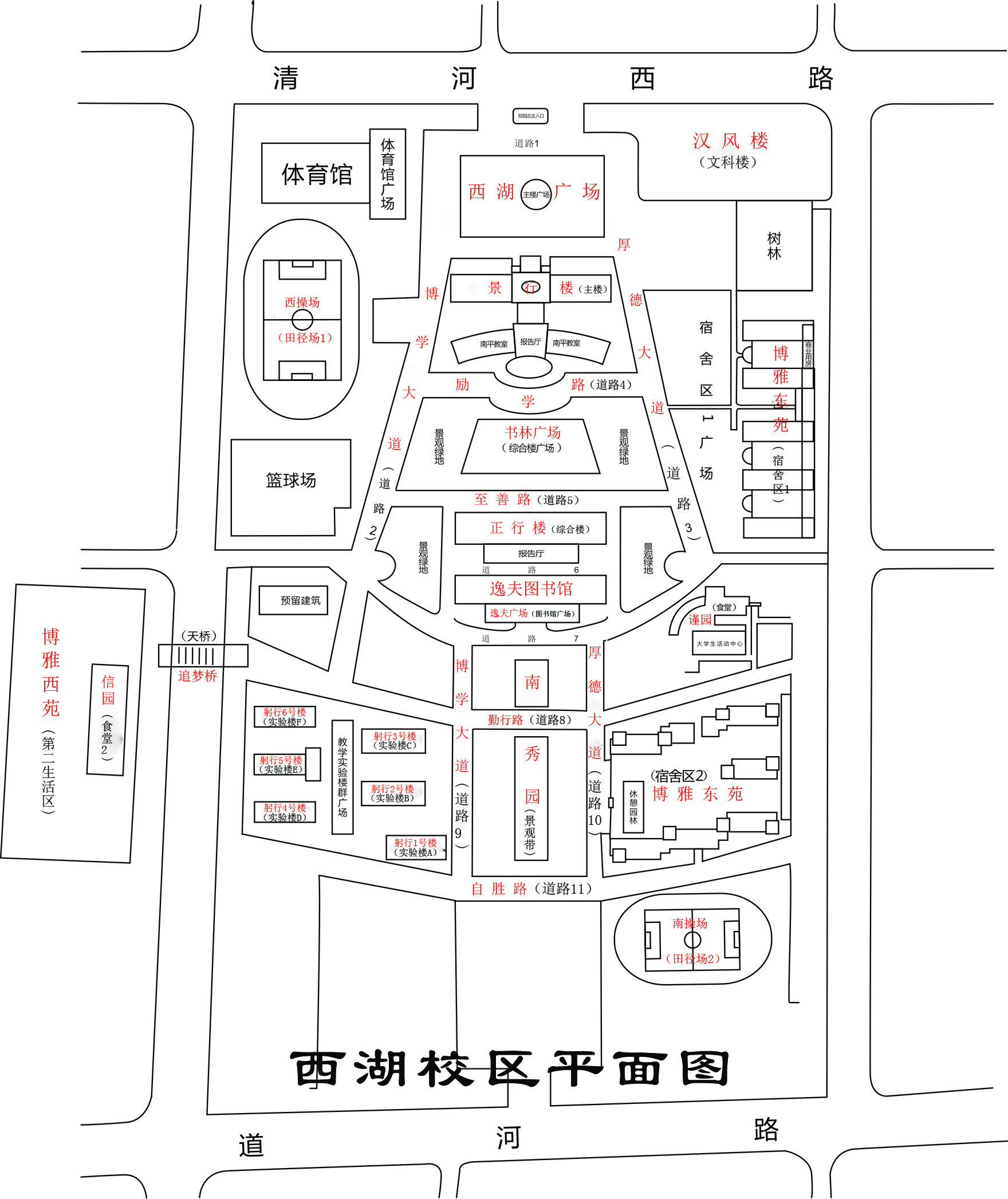 此外,教学主楼、综合楼、实验楼群三座楼依次坐落于西湖校区的主轴线上,分别以景行、正行、躬行为其命名,即各具特色,又遥相呼应、浑然一体、自成体系。
